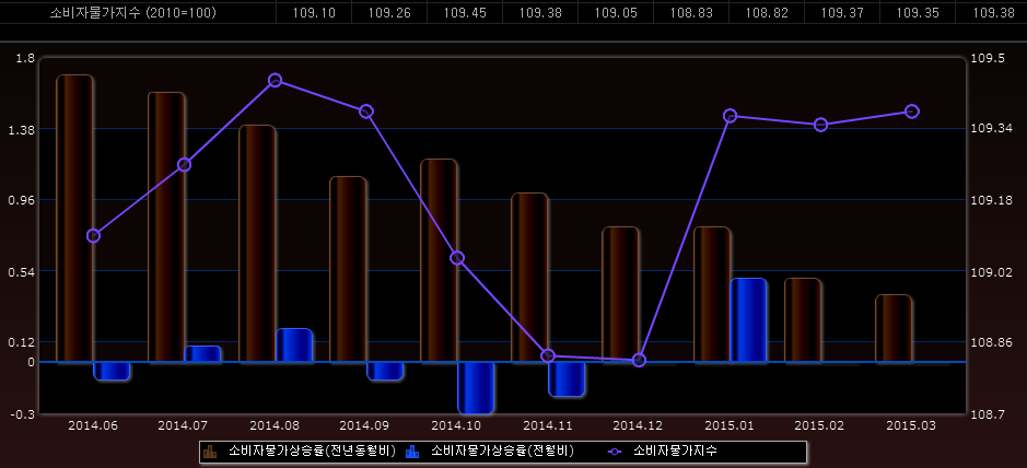 소비자물가지수는 통계청 자료에 의하면 2010년을 100으로 보았을 때 2015년은 109정도이다. 2010년대비 9% 인상되었다는 것이다. 2010년도의 100만원은 현재 가치로 109만원인 셈이다.