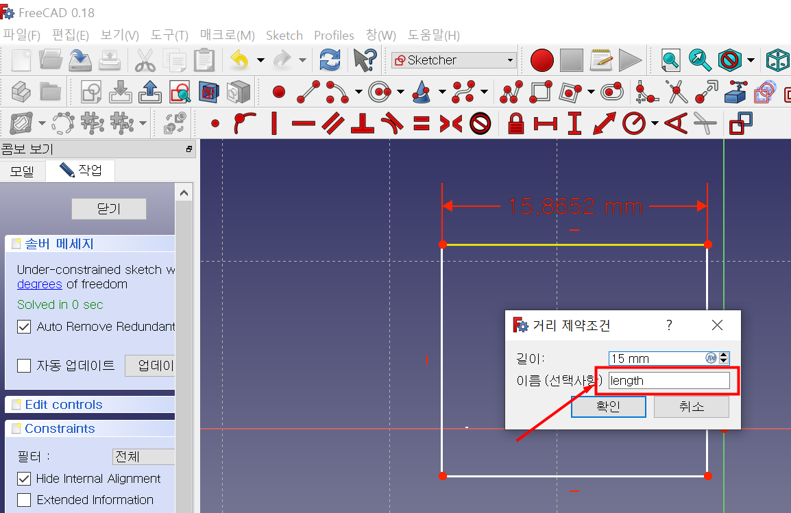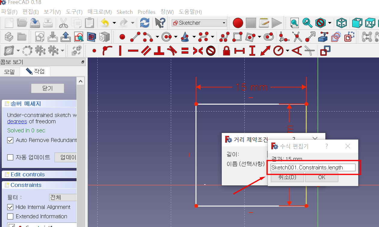 중간에 Constraints 라는 이름을 거쳐야 사용할 수 있다는 점에 유의해야 한다. 치수를 입력하는 창에서 숫자 대신 '='키를 누르면 수식편집기 창이 뜨고 거기에 수식을 입력할 수 있다.