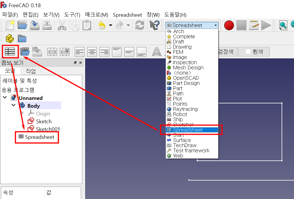 아예 spreadsheet를 하나 생성하고 거기에서 부품에 관련된 치수들에 이름을 붙여서 관리할 수도 있다. workbench에서 spreadsheet를 선택하면 부품에 Spreadsheet를 하나 생성할 수 있다.